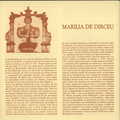 Esse prestígio ímpar dos versos de Gonzaga aparece confirmado sem sombra de dúvida pelas diversas e variadas adaptações musicais dos textos de Marília de Dirceu que este disco recolhe e divulga de forma primorosa. Não poderia ser mais seguro o índice de popularidade atingido pelo mito dos amantes infelizes de Villa Rica. Todas as Liras aqui reunidas pertencem à "segunda parte" do idílio, aquela de conteúdo mais